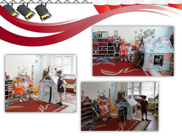 Завершился наш проект показом сказки «Теремок на новый лад» для ребят из параллельной группы. К показу готовились всей группой: подготовили декорации, нарисовали пригласительные билеты и вручили их ребятам и воспитателям группы №2. Перед представлением, как положено в театре, зрители, показывая пригласительные билеты билетерам, прошли на свои места. Артисты очень волновались, ведь это их первое выступление. А некоторые зрители, увидев ребят в костюмах, проявляли большой интерес и к тому, что происходит «за кулисами». Но вот уже прозвенел третий звонок и представление началось… Как мы знаем, сказка «Теремок» заканчивается тем, что медведь ломает теремок. Наша сказка не исключение. Но звери вместе, дружно построили новый дом, «космический», ведь через два дня ребят ждет «Неделя космоса». А пока у наших артистов – первые аплодисменты! Молодцы!