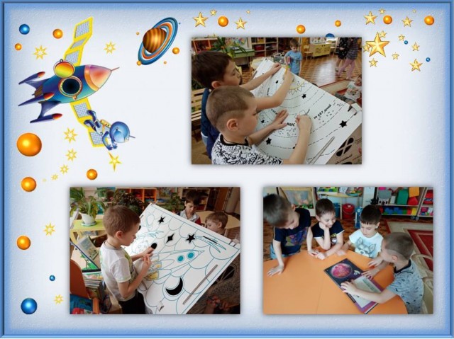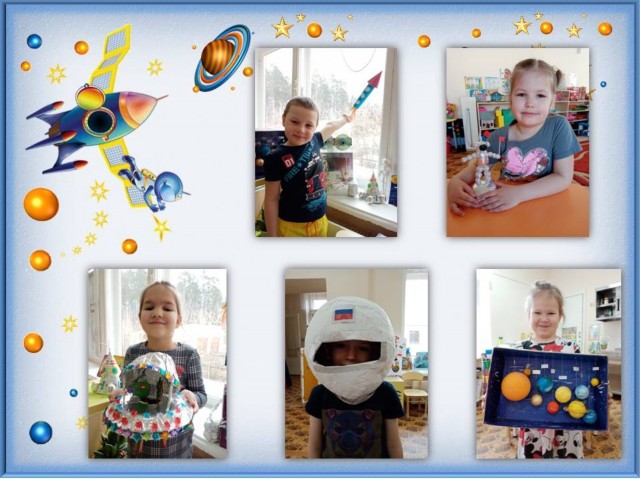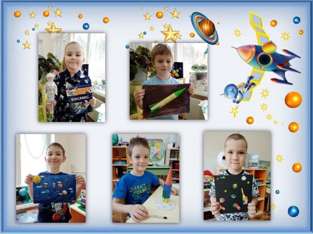 Для ребят тема космоса очень интересна, в ней много необычного, фантазийного. На протяжении всей недели в нашей группе проходили мероприятия, посвященные Дню космонавтики: беседы о космосе, о знаменитых космонавтах; рассматривание иллюстраций с изображением загадочного мира звезд и планет; чтение стихов и загадок о космосе; рисование, лепка и конструирование на данную тему. В группе появились два маркера игрового пространства: ракета и «пункт управления полетом». Дети с удовольствием представляли себя космонавтами, а также уверенно «управляли полетом ракет с Земли». Была оформлена тематическая выставка рисунков и космических экспонатов. Воспитанники со своими мамами и папами смастерили замечательные «космические» поделки. Чего среди них только нет: ракеты и летающие тарелки, космонавты и инопланетяне, планеты Солнечной системы и даже скафандр и многое другое. Работы получились яркие, оригинальные и красочные.