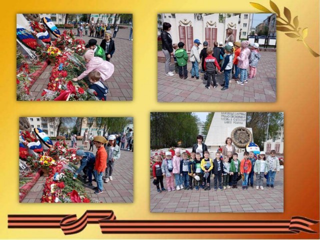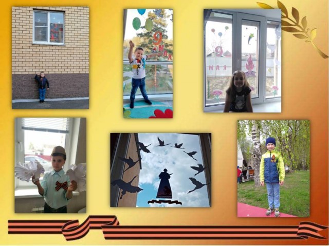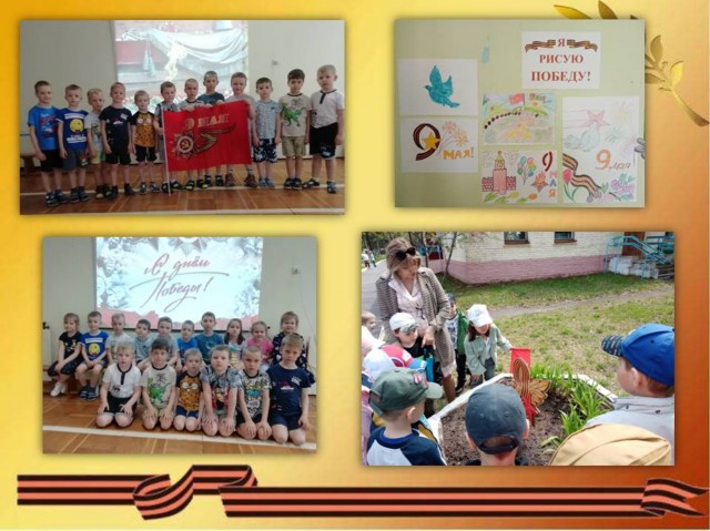 Для создания праздничного настроения оформлена развивающая среда в группе, в уголке для родителей подготовлена папка-передвижка. Родители вместе с детьми приняли участие в акциях «Окна Победы», «Письмо солдату». Вместе со своими детьми они ходили на парад и возлагали цветы к Вечному огню и обелискам.
