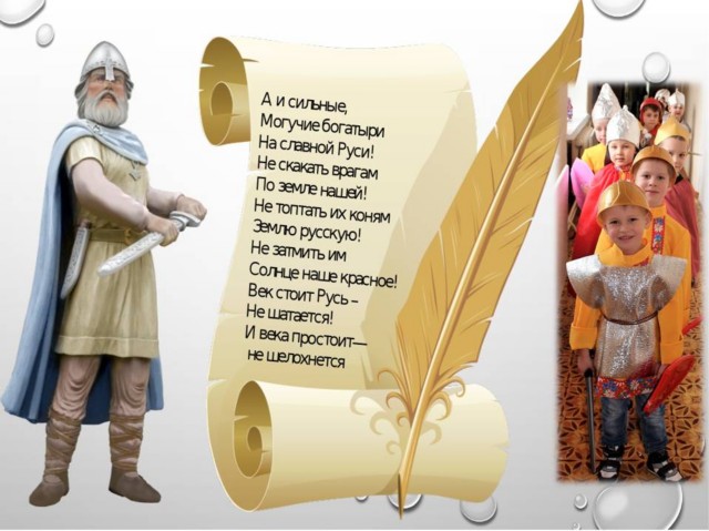 С давних лет так повелось: как только на нашу землю приходил враг все русские люди и стар и млад поднимались на борьбу. Издавна славилась русская земля богатырями. Богатыри -это защитники земли русской, люди безмерной силы, стойкости и отваги, совершающие воинские подвиги. Богатыри охраняли нашу Родину от врагов, стояли на заставе (границе). Мимо них ни зверь незамеченным не проскользнет, ни птица не пролетит, а тем более враг не пройдет.