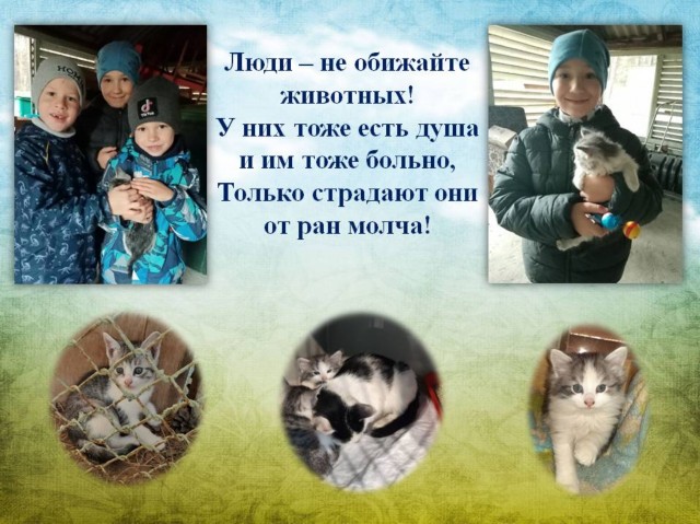 Мы решили приучать наших детей к соучастию и взаимопомощи, и организовали в нашей группе акцию по сбору кормов для бездомных животных «Большая помощь маленькому другу». Родители вместе с детьми собрали корм для кошек и собак и отвезли в городской приют ЗАТО «Верный друг». Формирование заботливого и бережного отношения к животным имеет большое значение в жизни ребенка. Вовлекая ребенка в совместную деятельность по уходу за домашними питомцами, взрослые развивают в нем чуткость, умение понимать другую жизнь, побуждают к сочувствию, воспитывают готовность помочь делом.